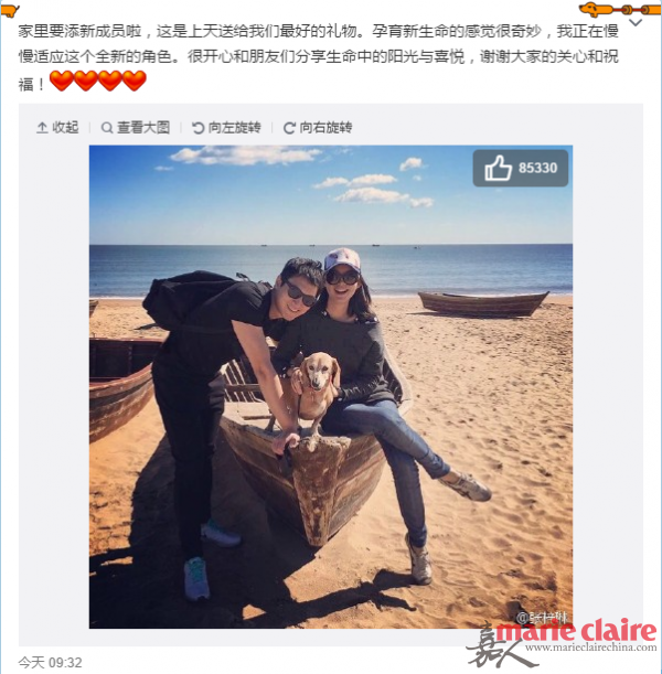 最近又迎来了一波生子潮,昨天在为狗狗开的微博上暗示自己有了宝宝的张梓琳今天在微博上正式公布了自己怀孕了的消息。